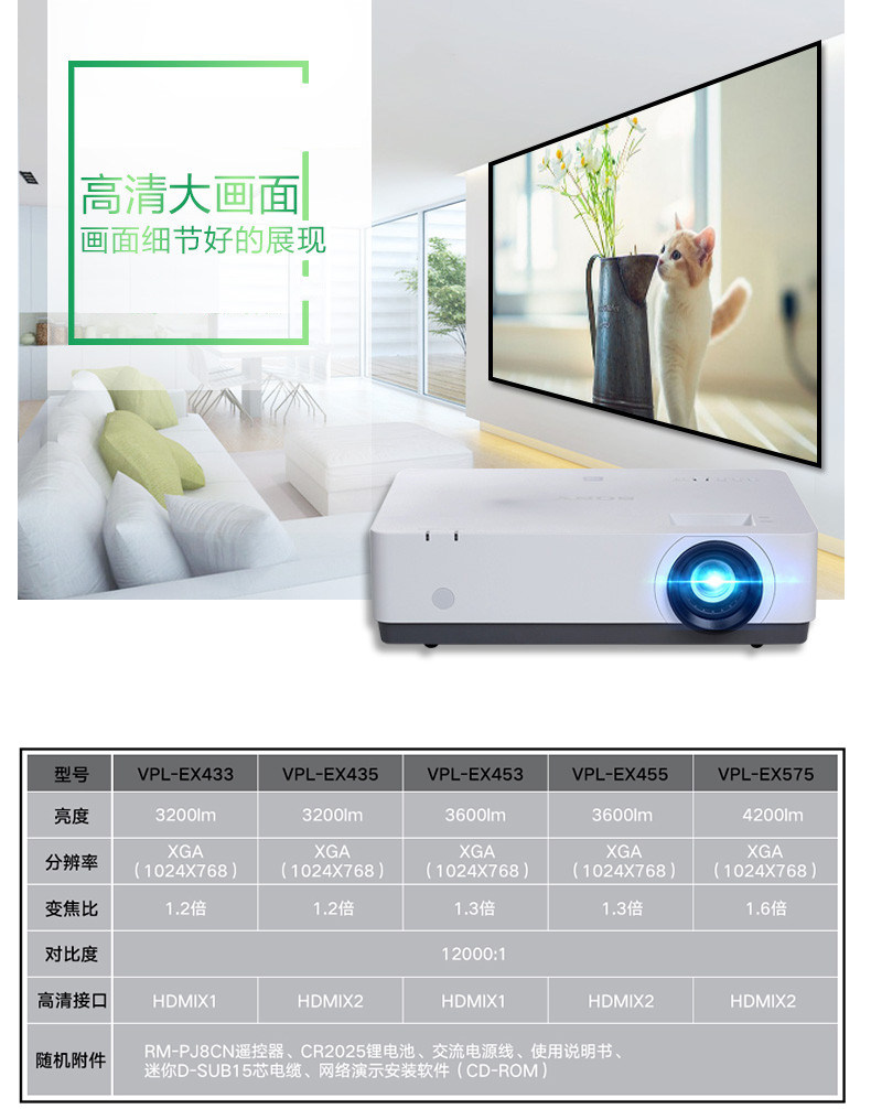 索尼VPL-EX455办公会议投影仪 培训教育商务 家用高清投影机