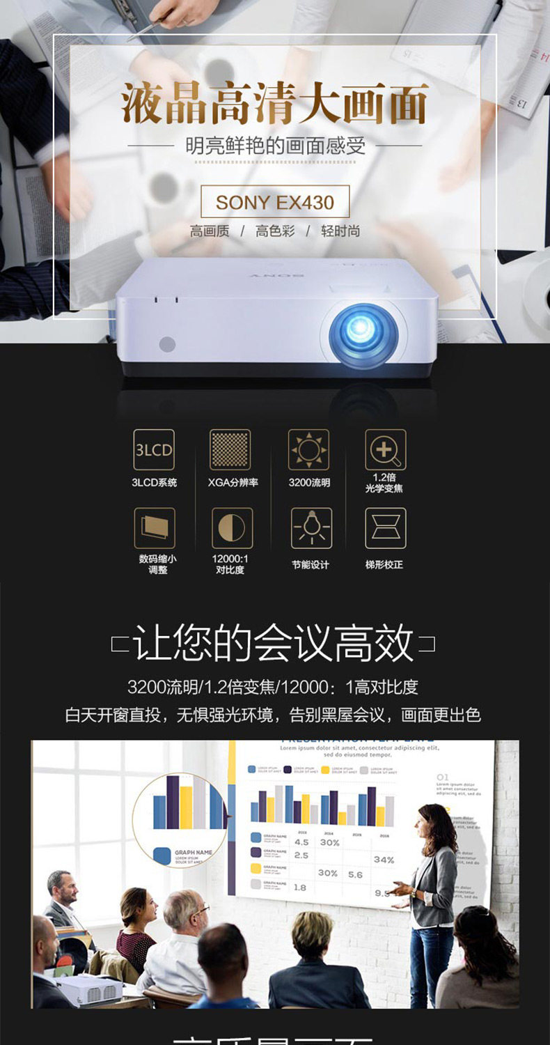 索尼VPL-EX430 便携家用会议教学商务开会携带投影机商务会议室培训高亮1024*768经典实惠款