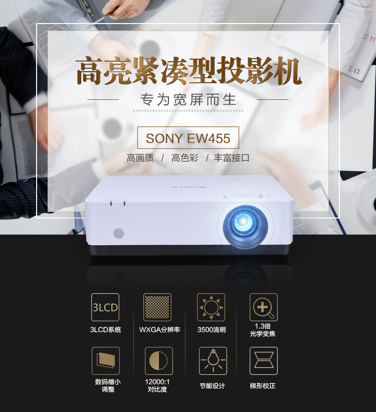 索尼VPL-EW455投影仪办公无线会议3500流明宽屏