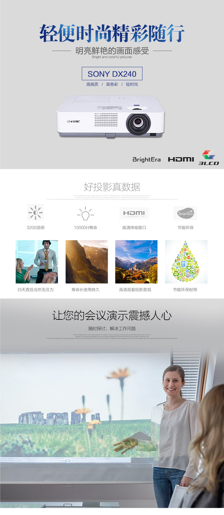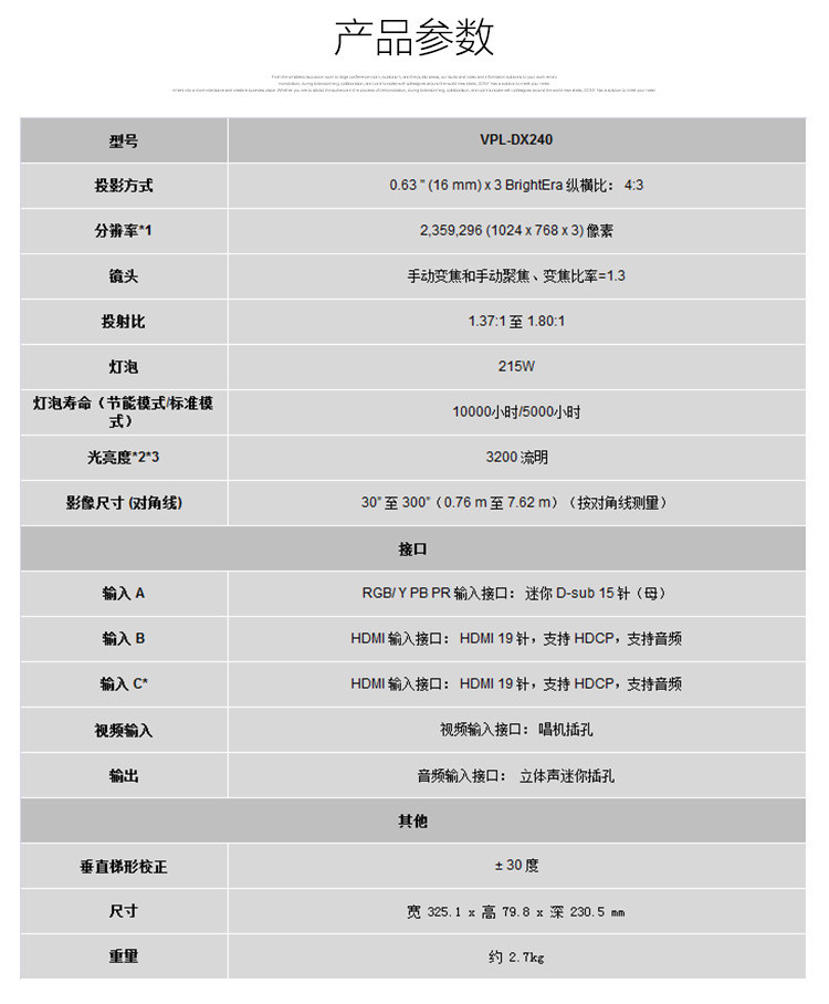 索尼VPL-DX241投影仪家用高清商务办公投影机商务会议室培训高亮1024*768经典实惠款