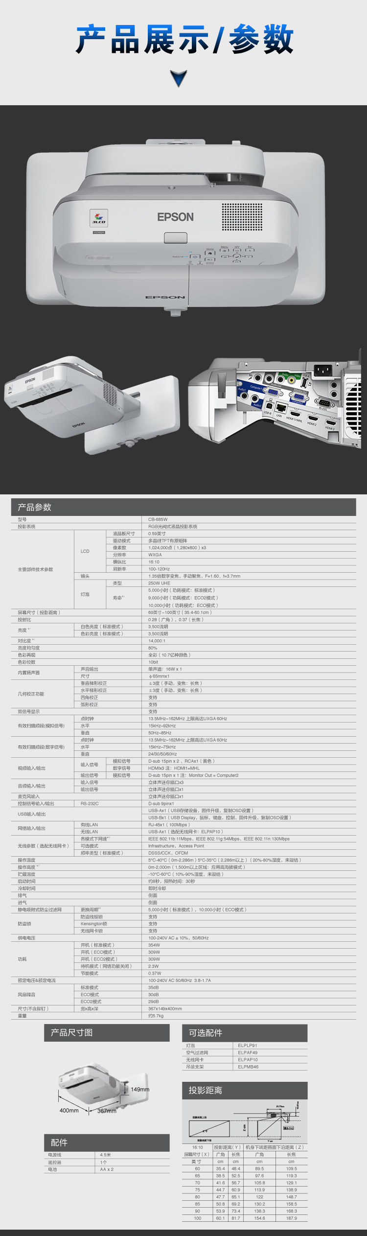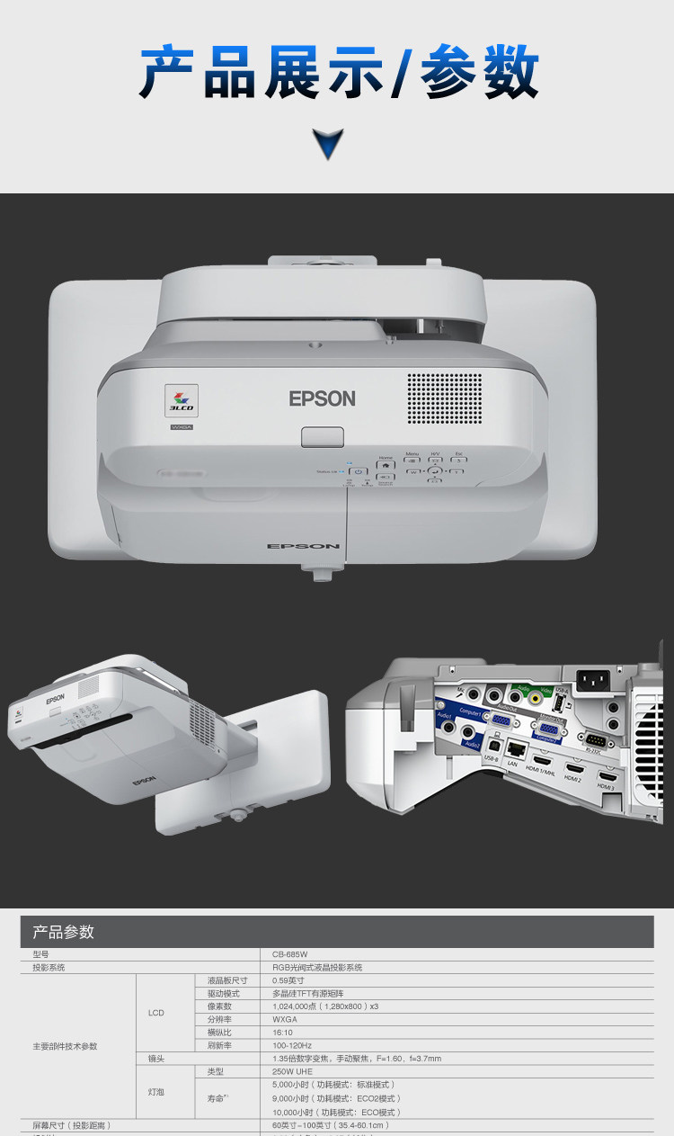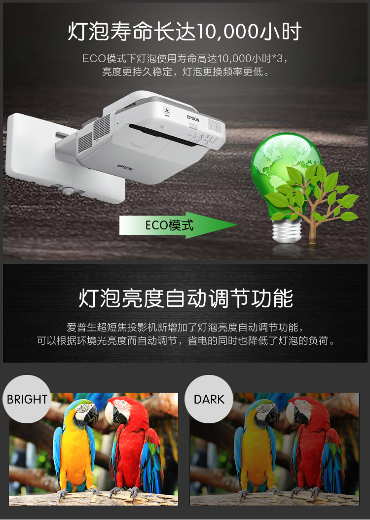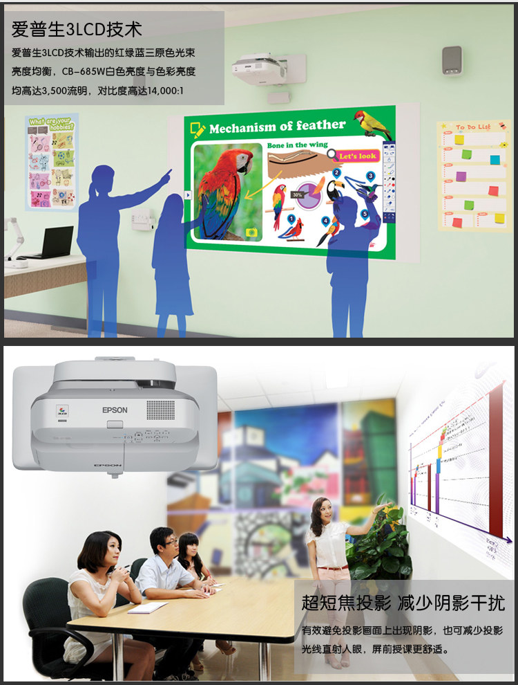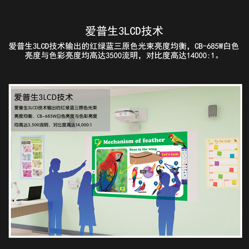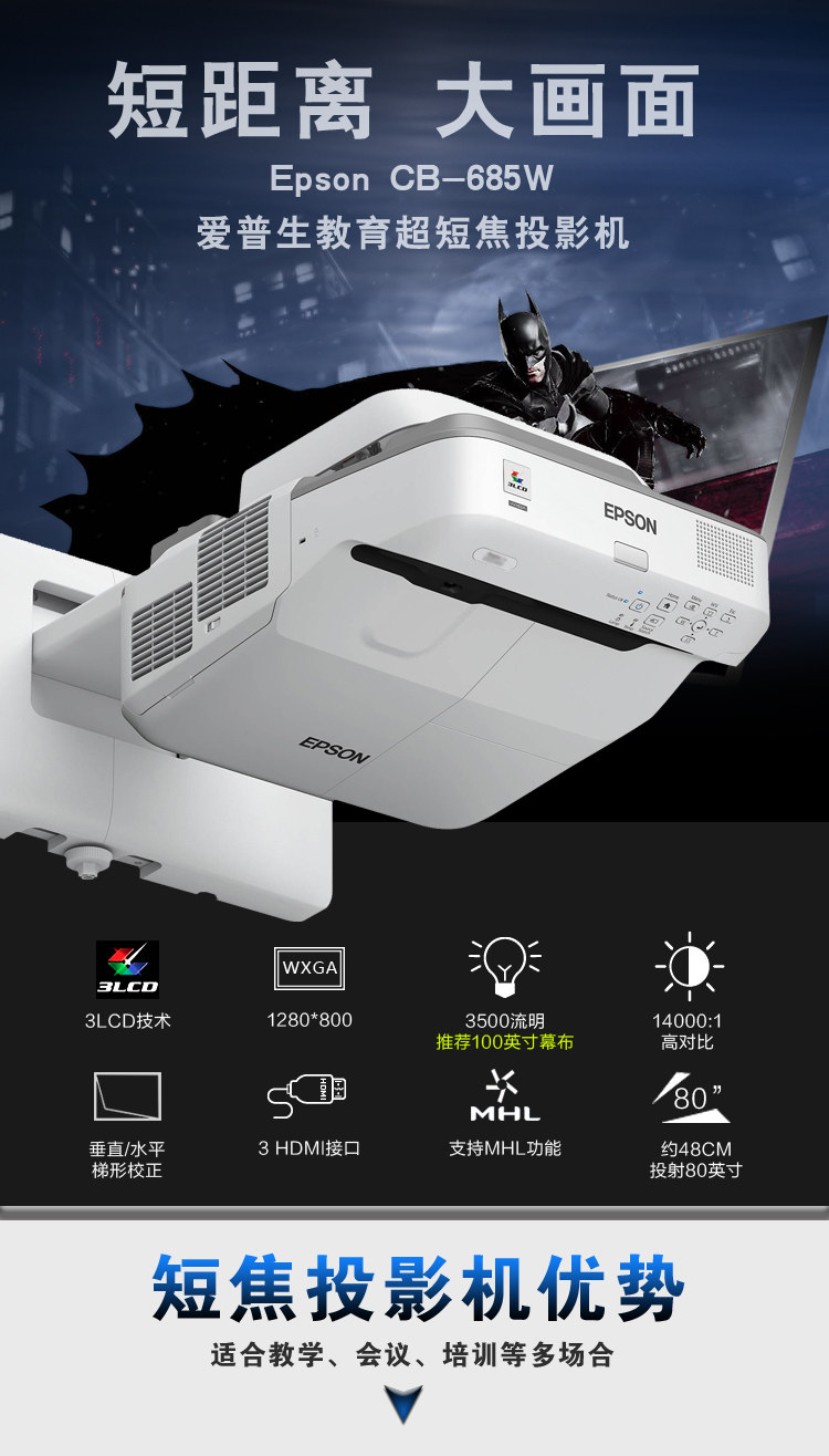 爱普生CB-685W 教育教学超短焦投影仪高亮商务培训反射式投影机3500流明