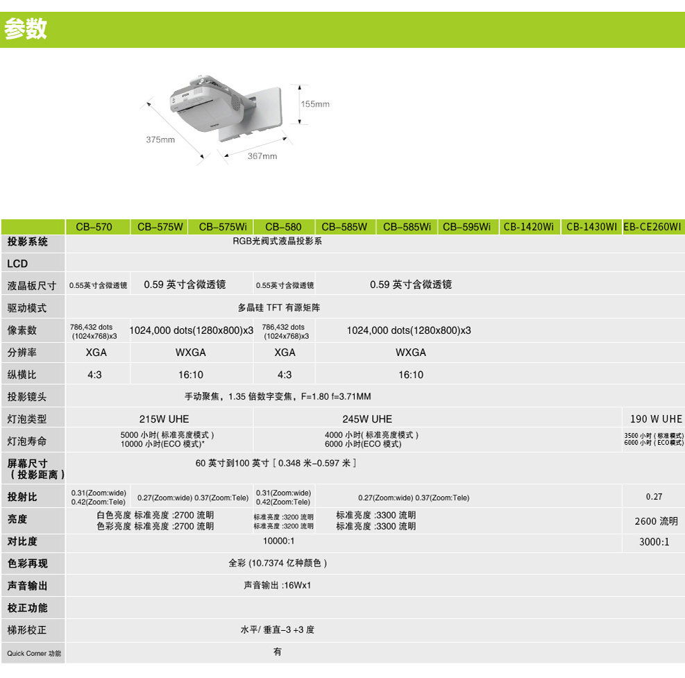 爱普生CB-580教育教学超短焦投影仪高亮商务培训反射式投影机交互