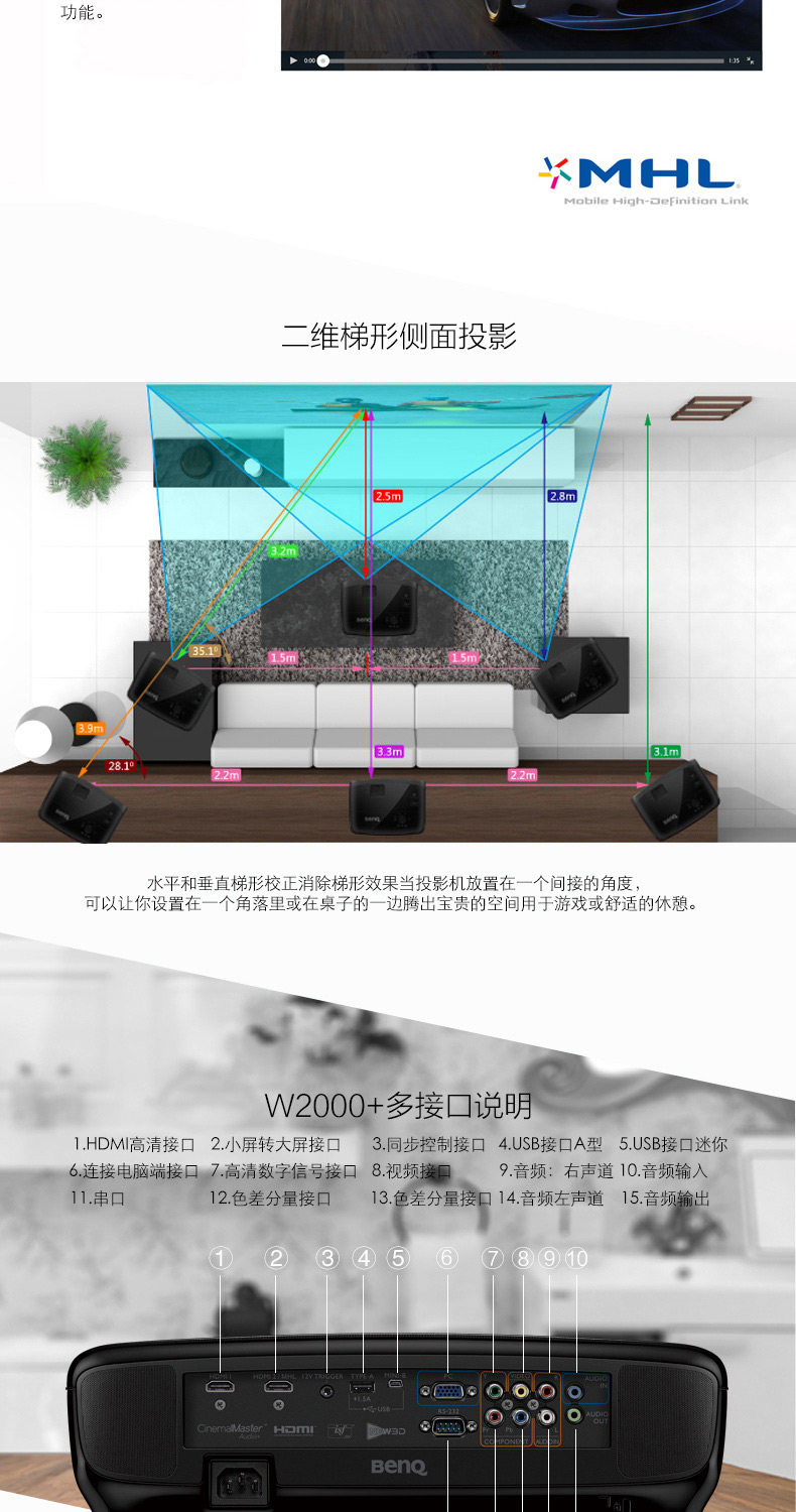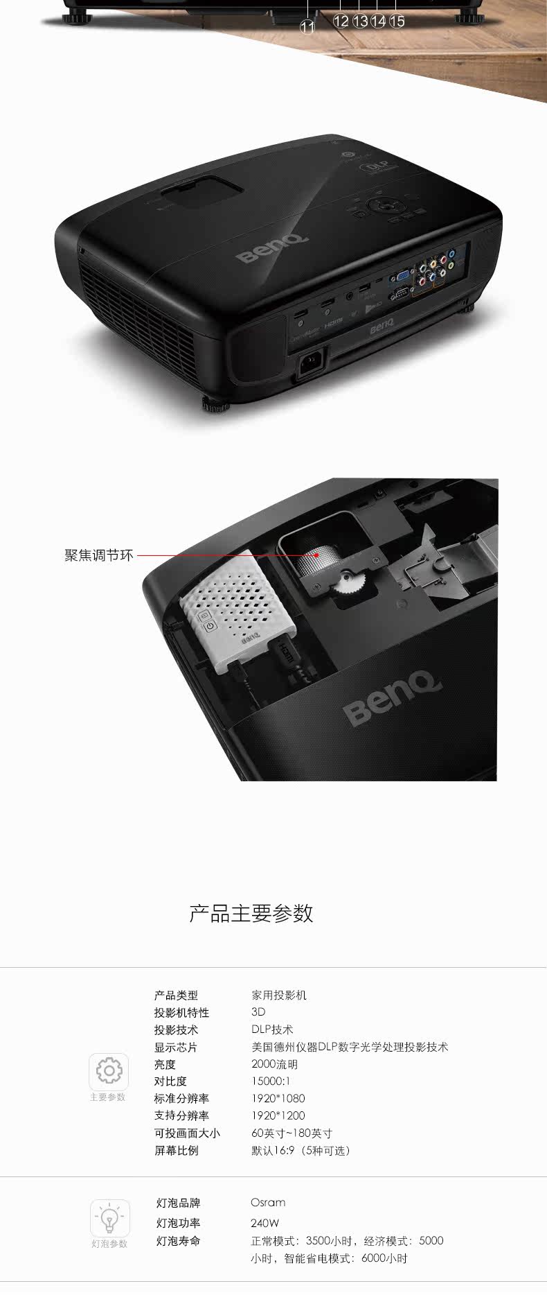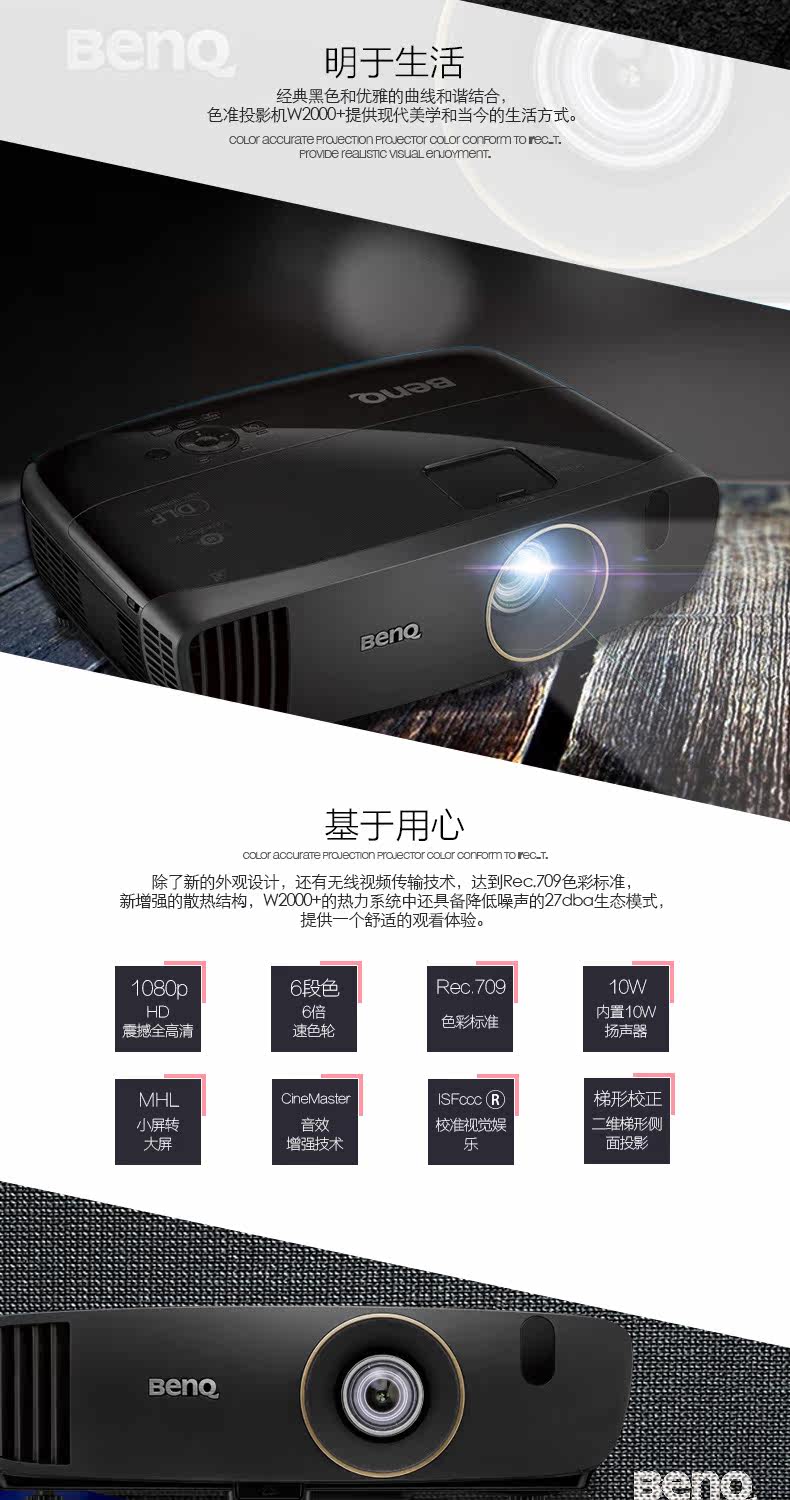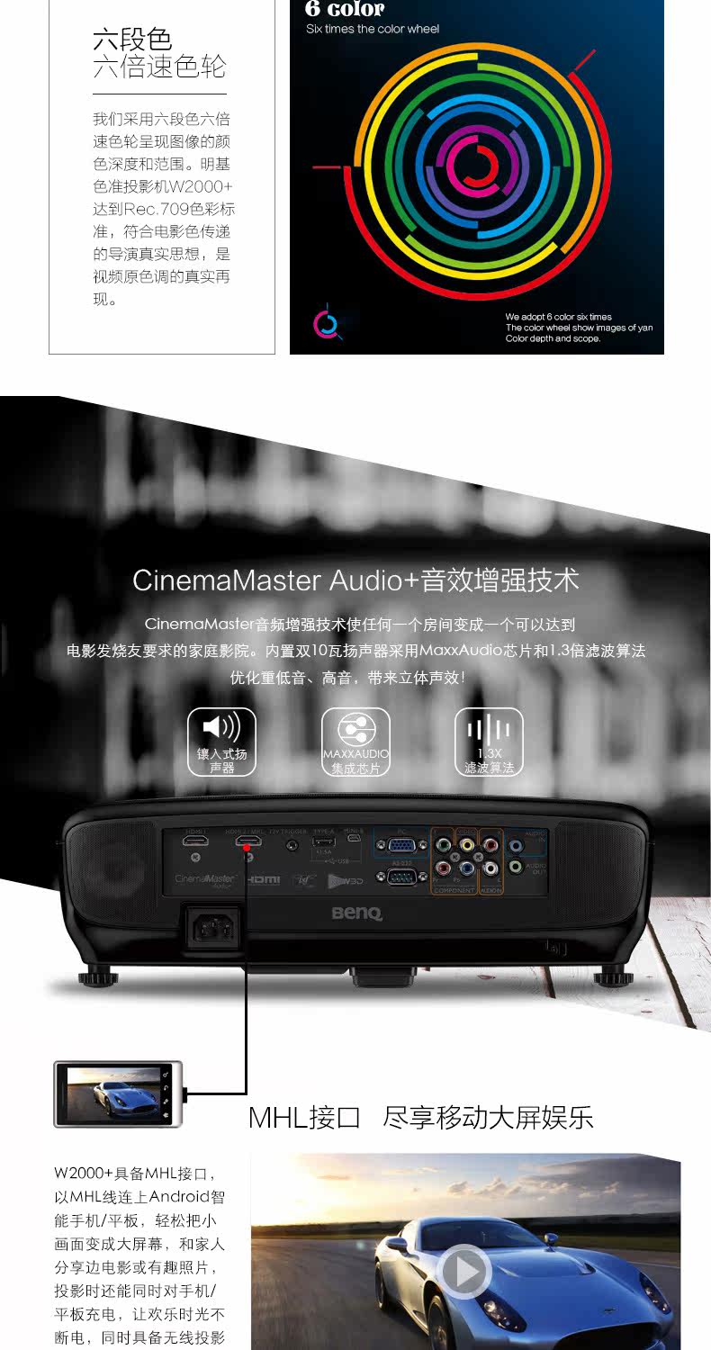 明基W2000+投影仪蓝光3D高清1080P家用家庭影院投影机 送3D眼镜*3+天猫魔盒+高清线