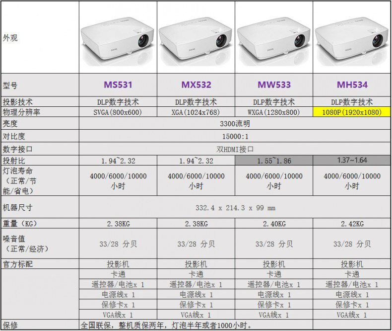 明基MH534高清投影仪1080P 家用办公商务教学便携投影机价格可优