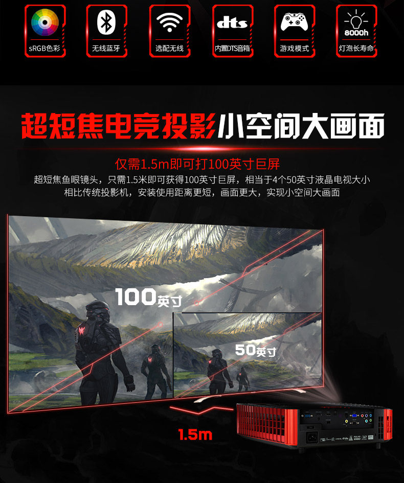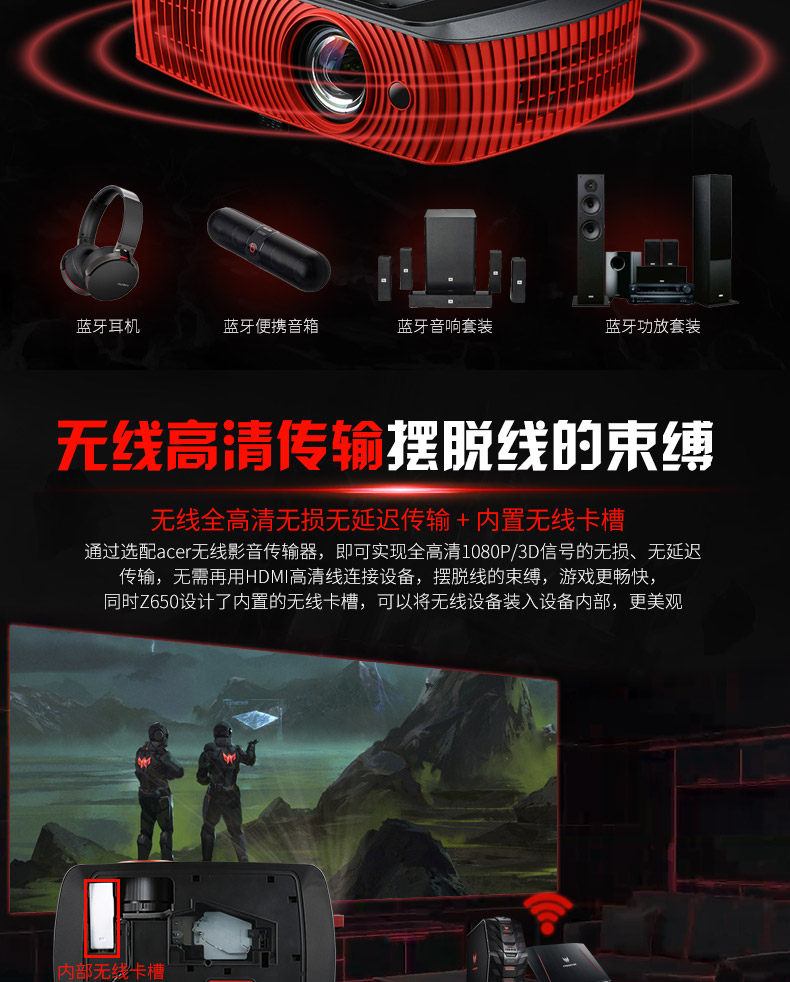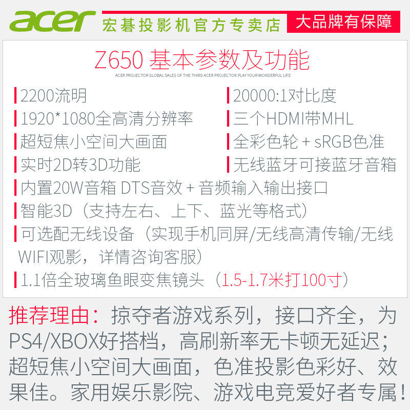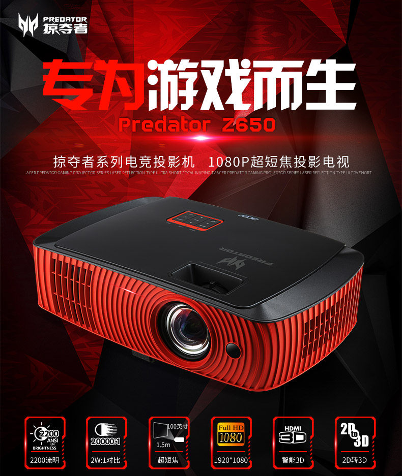 宏碁(Acer)掠夺者 Z650 全高清1080P电竞投影仪 家用短焦游戏投影机 3D投影电视