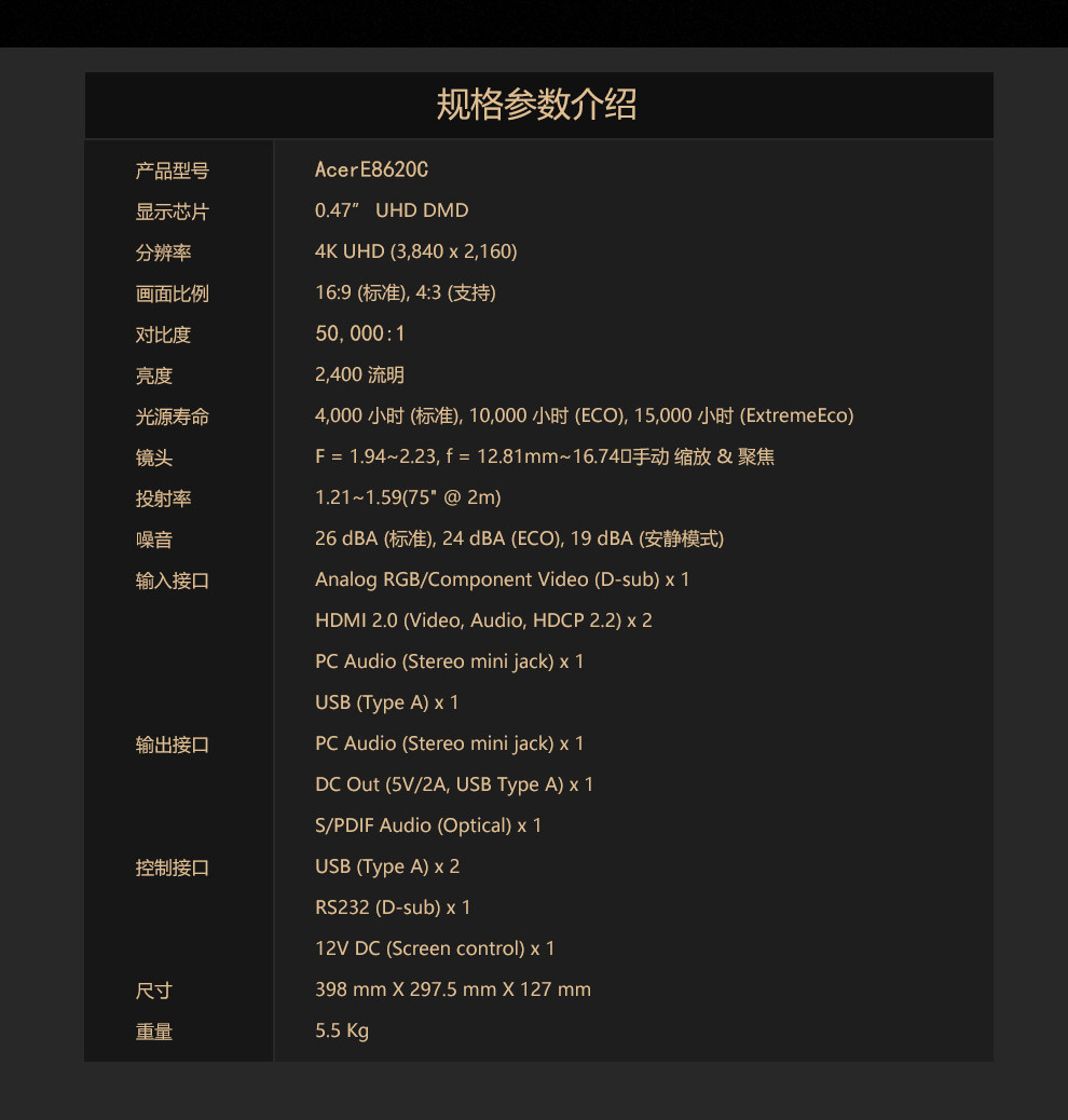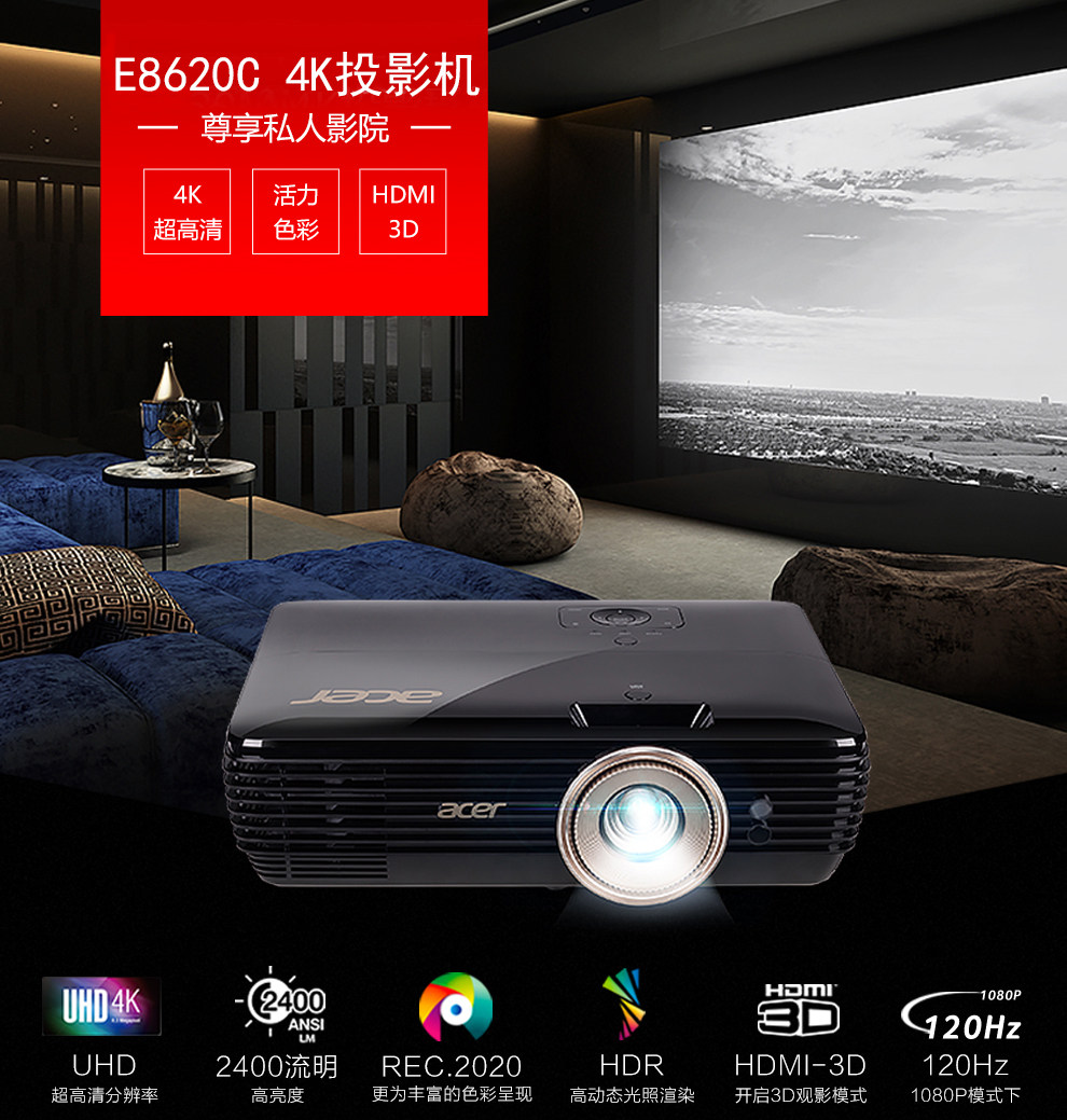 宏碁E8620C超高清4K家3D投影机HDR渲染色准认证专业家庭影院投机别墅视听室大平层客厅影视厅抗光投影