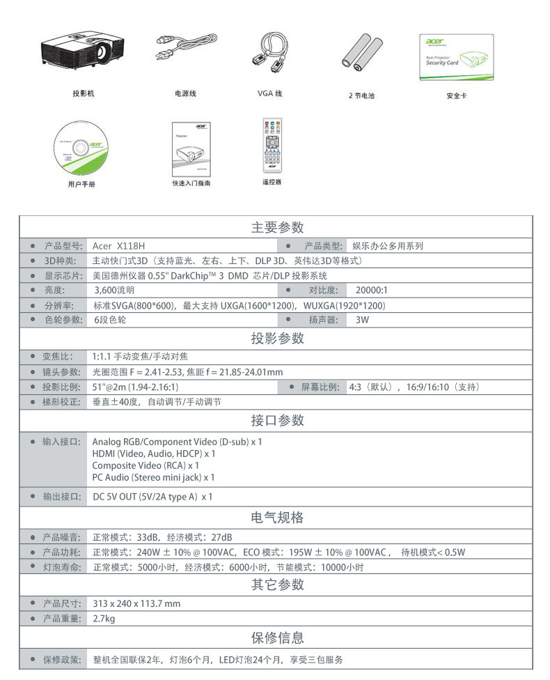 宏基 X118H 家用投影仪高清3D商务办公会议教学