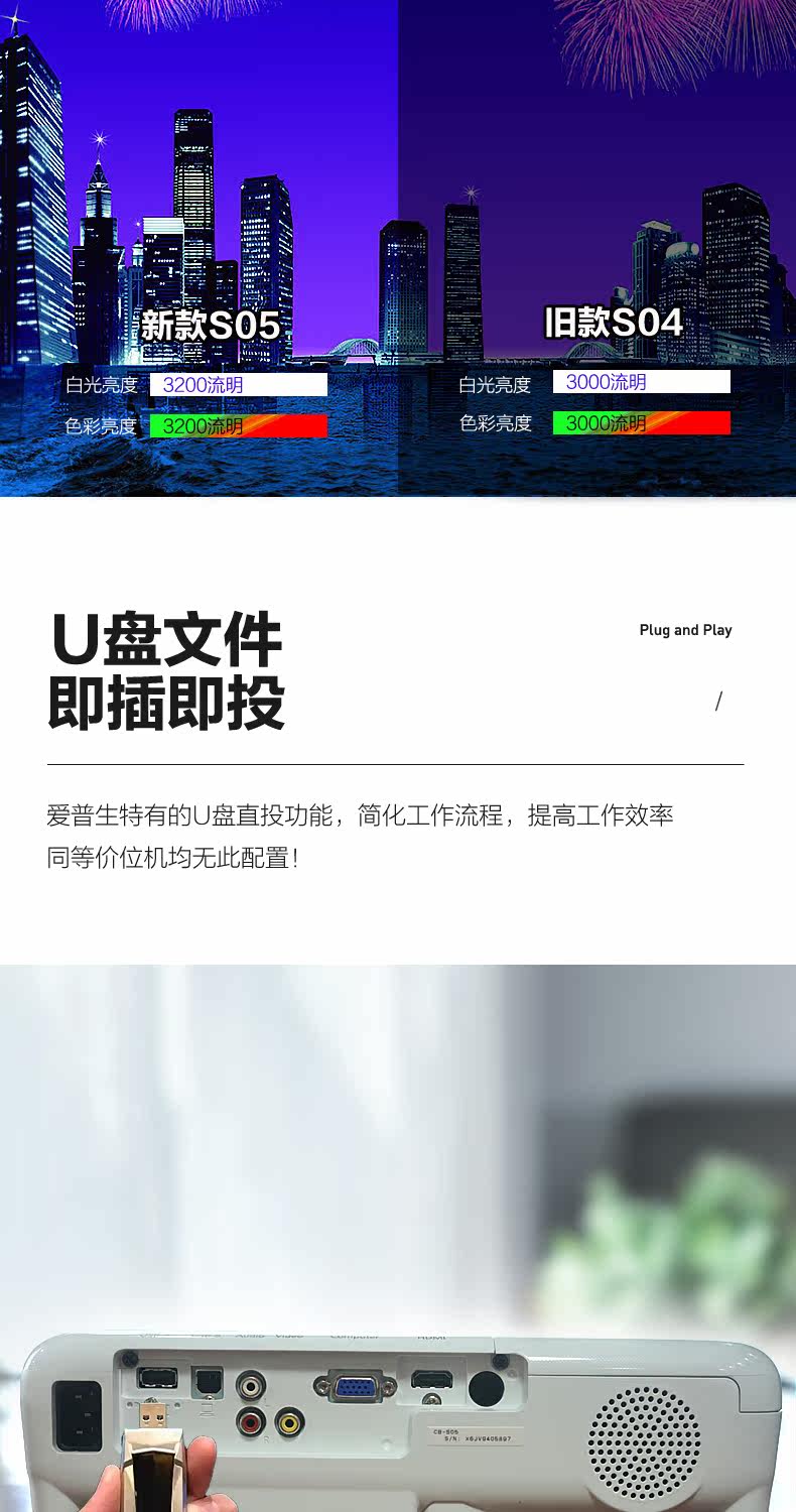 epson/CB-S05爱普生投影仪办公用会议高清1080高亮3200流明白天直投教室教育培训小型短焦手机wifi便携投影机