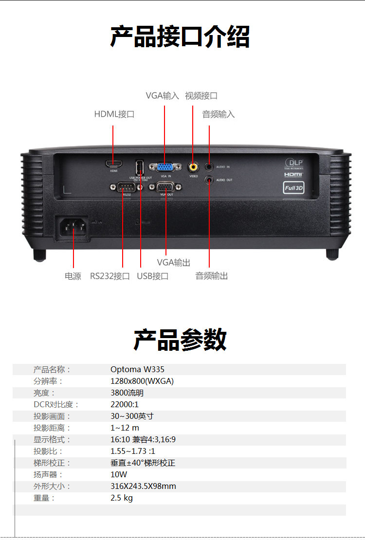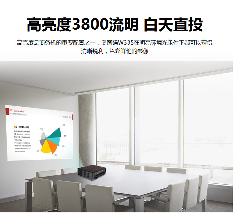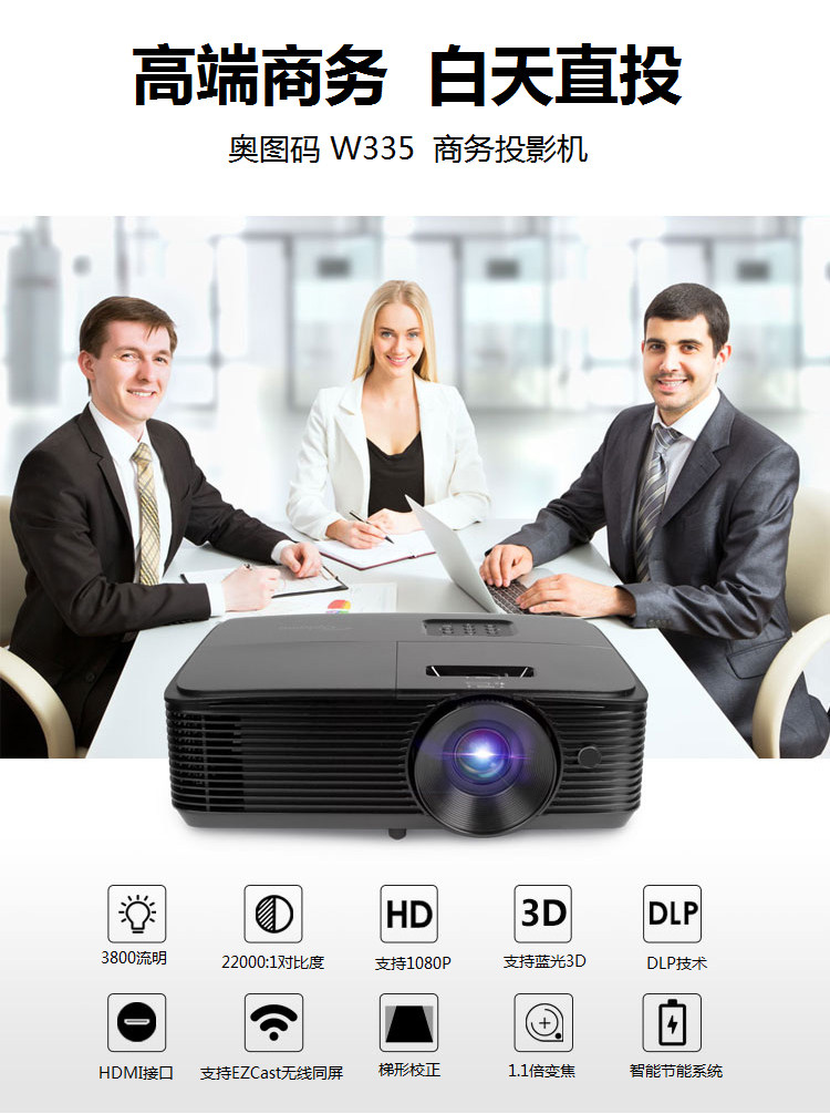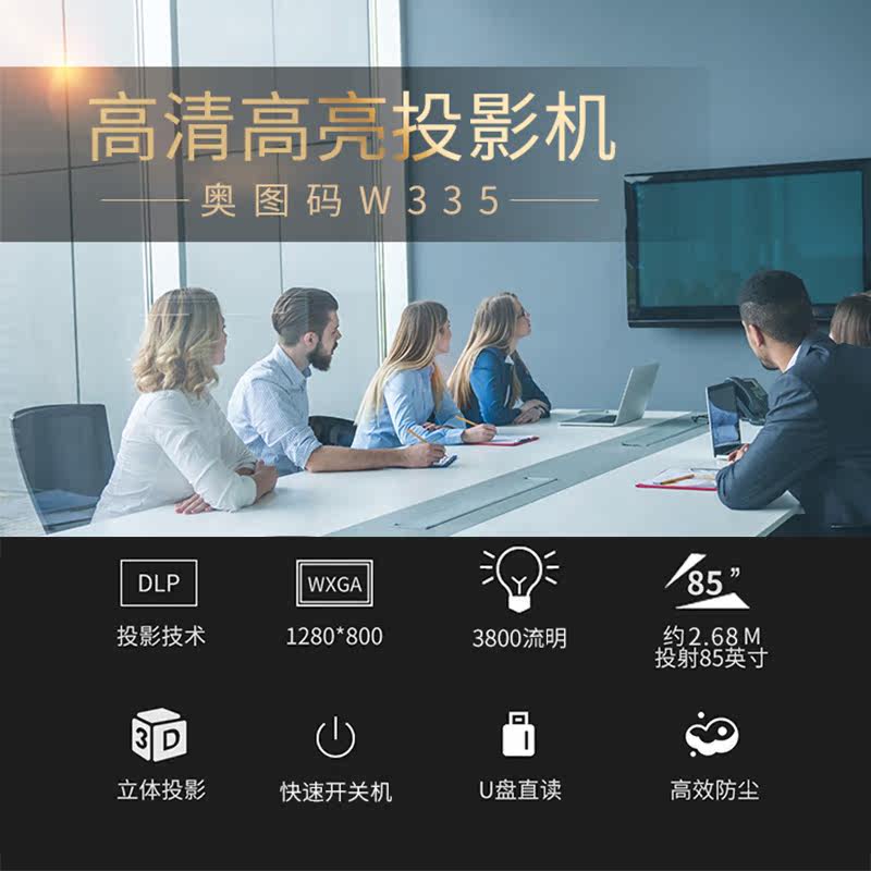 Optoma奥图码W335高端商务办公投影仪无线宽屏高亮3800流明家用办公开会教学培训3D支持1080P高清投影机