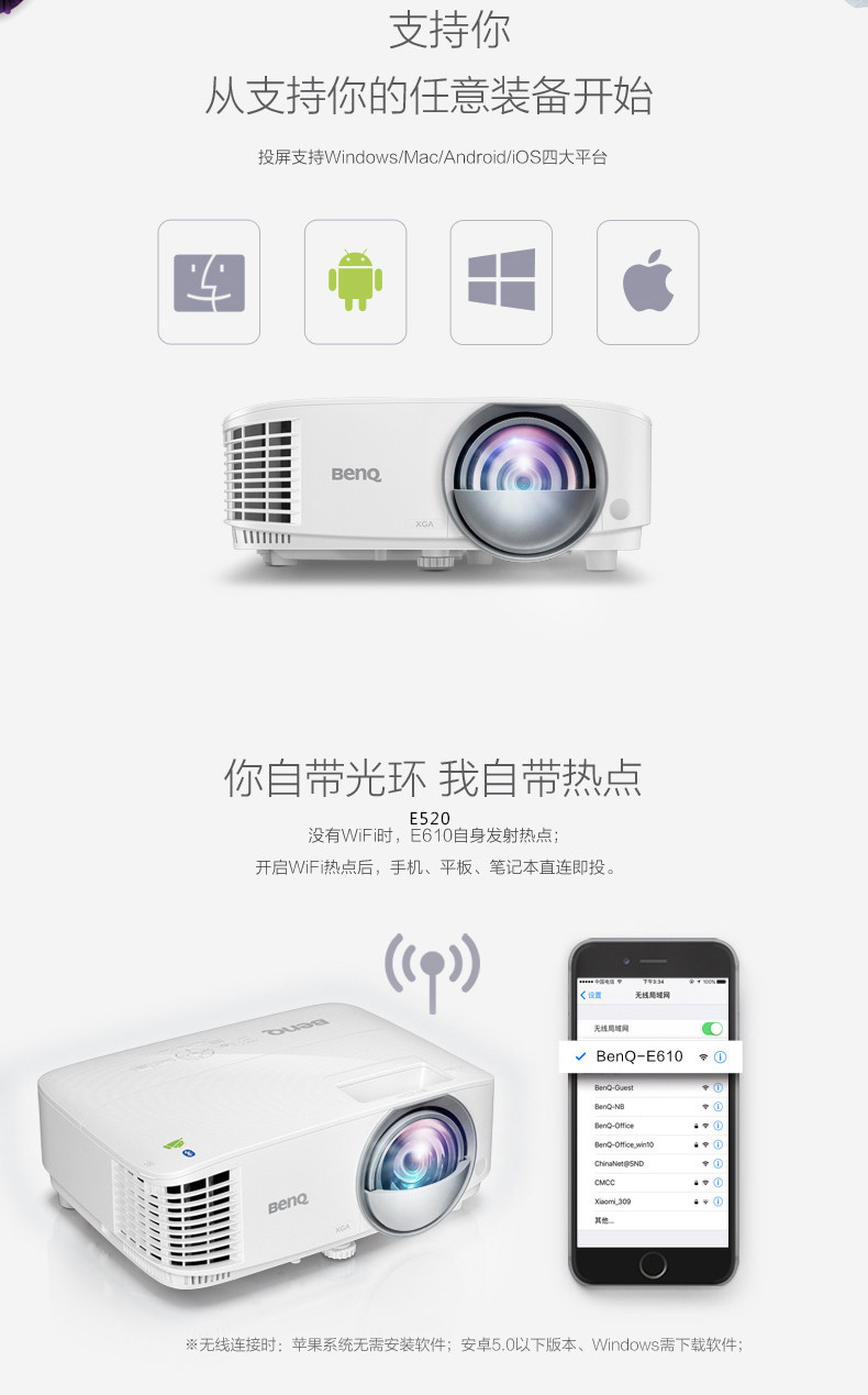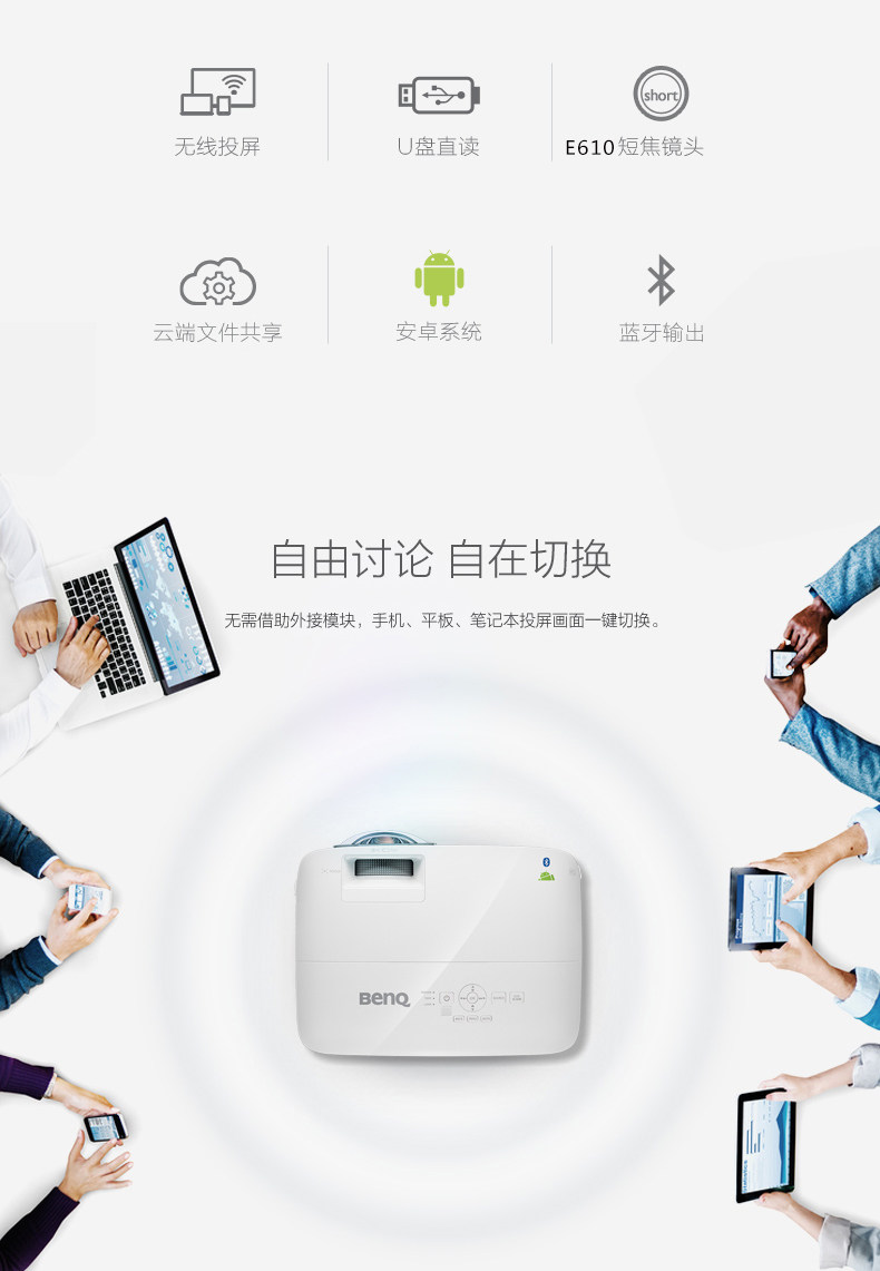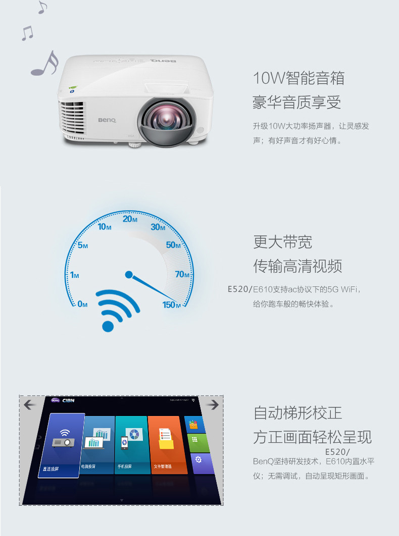 BenQ明基E610手机投影仪支持1080P高清家庭影院家用小型便携无线WiFi短焦办公商务会议培训教学投影机投墙3D