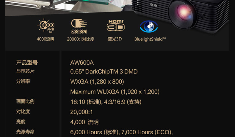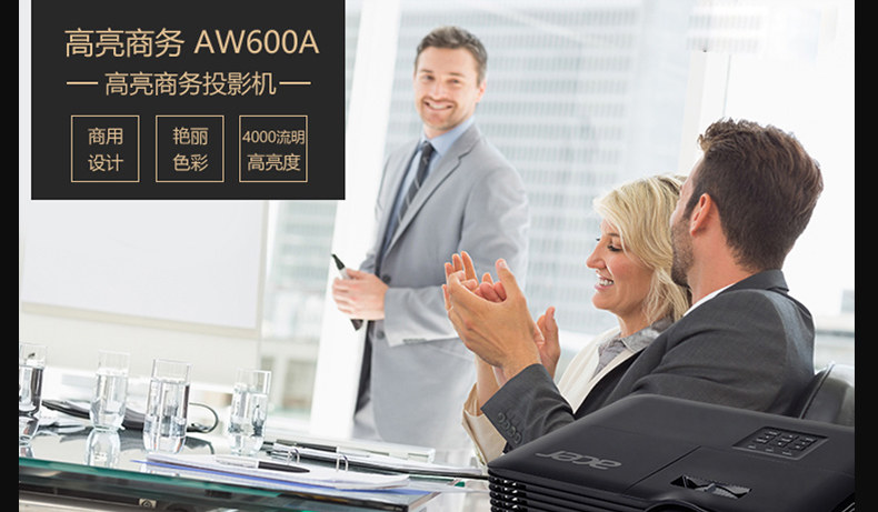 Acer宏碁3D高亮商务投影仪AW600A高清4000流明智能办公教育培训多媒体教室展厅360度环幕系统投影机